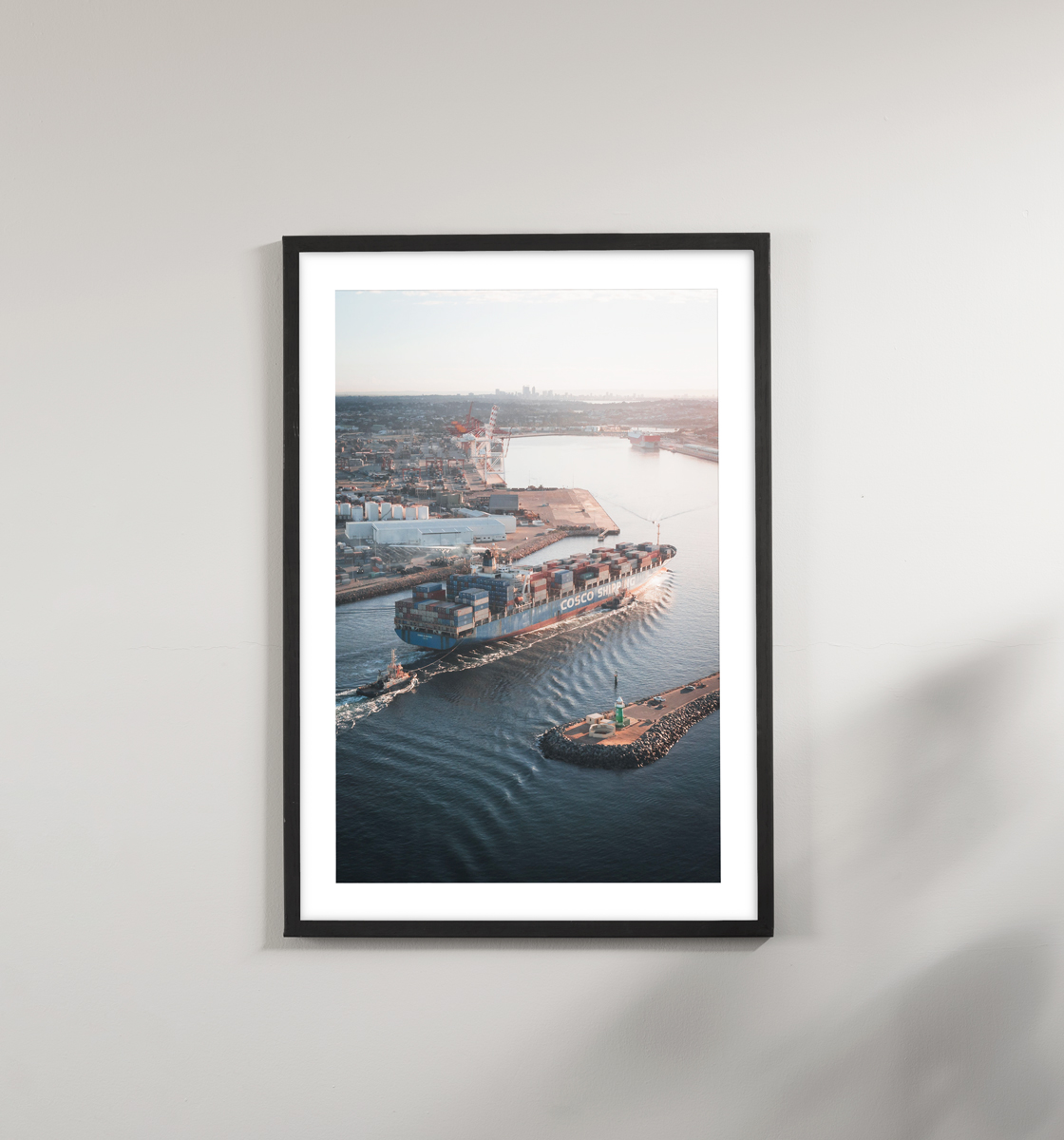 A container ship glides into Fremantle Port on a perfect summer morning in Western Australia.